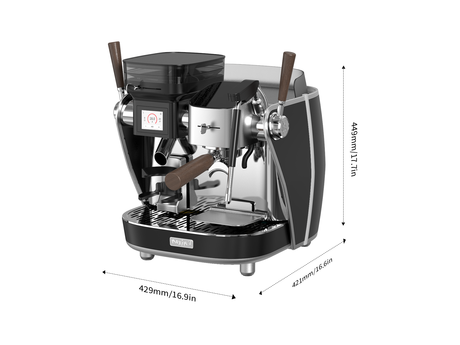 The Seine X was designed in the Pierre Cardin Studio, and draws inspiration from the Simca, a French classic car from the 1950s. The body of the coffee machine is aerospace-grade aluminum with natural wood accents which gives the machine a timeless aesthetic that will complement any space in your home.